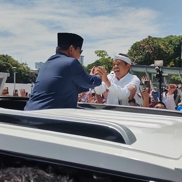KDM yang memakai pakaian serba putih itu pun naik ke atas mobil dari arah depan menghampiri Prabowo yang berdiri di tengah mobil. Keduanya lantas bersalaman dan sempat menyapa warga bersama.